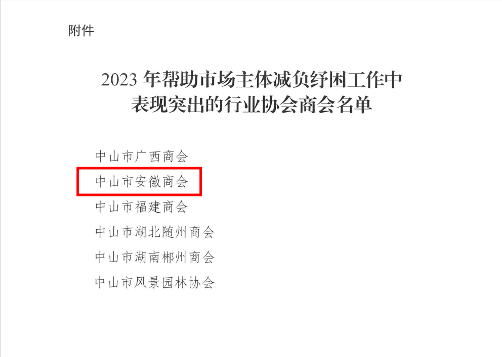 2023年11月10日,中山市民政局发出通报,对在助企减负纾困工作中表现突出的6家协会商会予以表扬,中山市安徽商会名列其中。